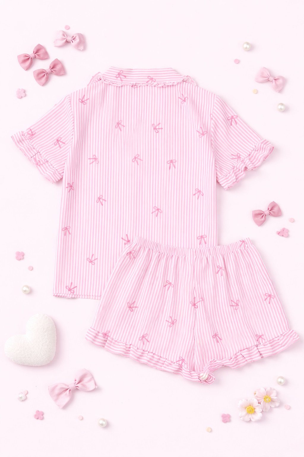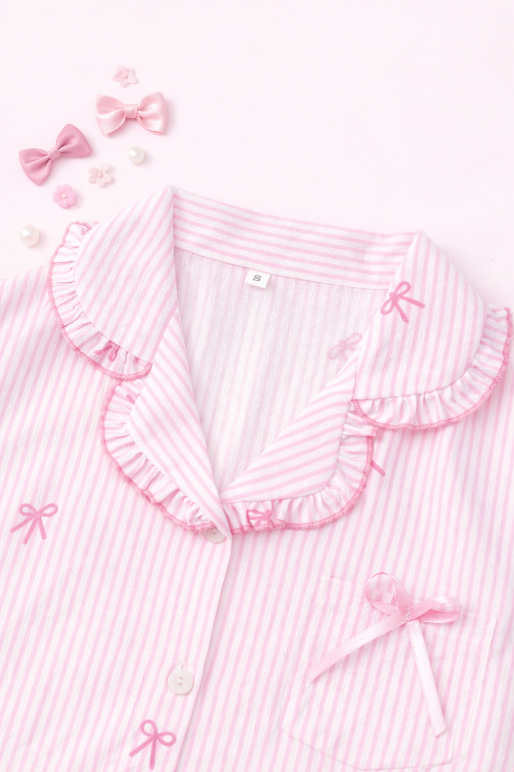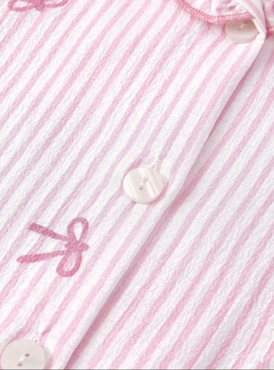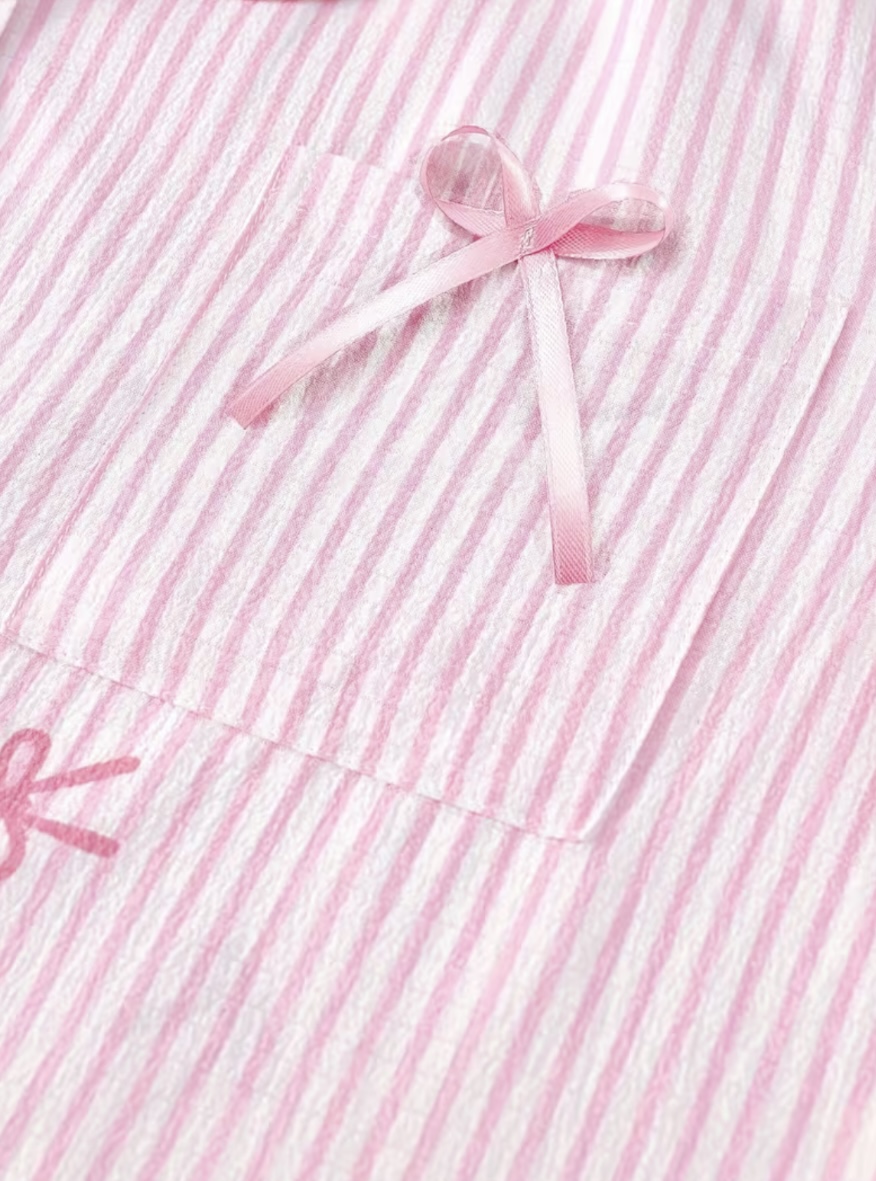 Snuggle into the Sweet Dream Set! Includes a soft striped bow pyjama set and ultra-fluffy socks with the sweetest bow embroidery. Perfect for slow mornings, cosy nights, and staying cute while staying warm.