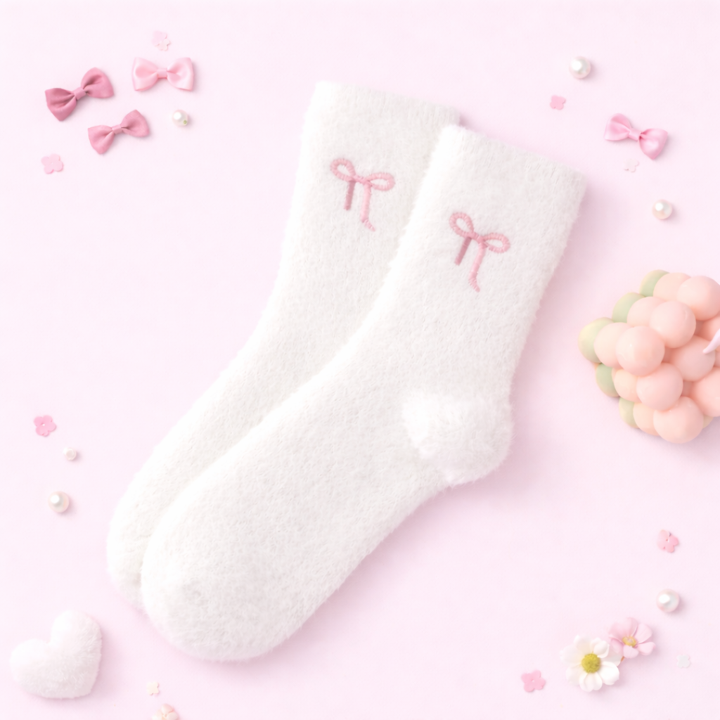 Soft, cosy and finished with the sweetest little bow embroidery, these fluffy socks are made for slow mornings, comfy nights and staying cute while staying warm.